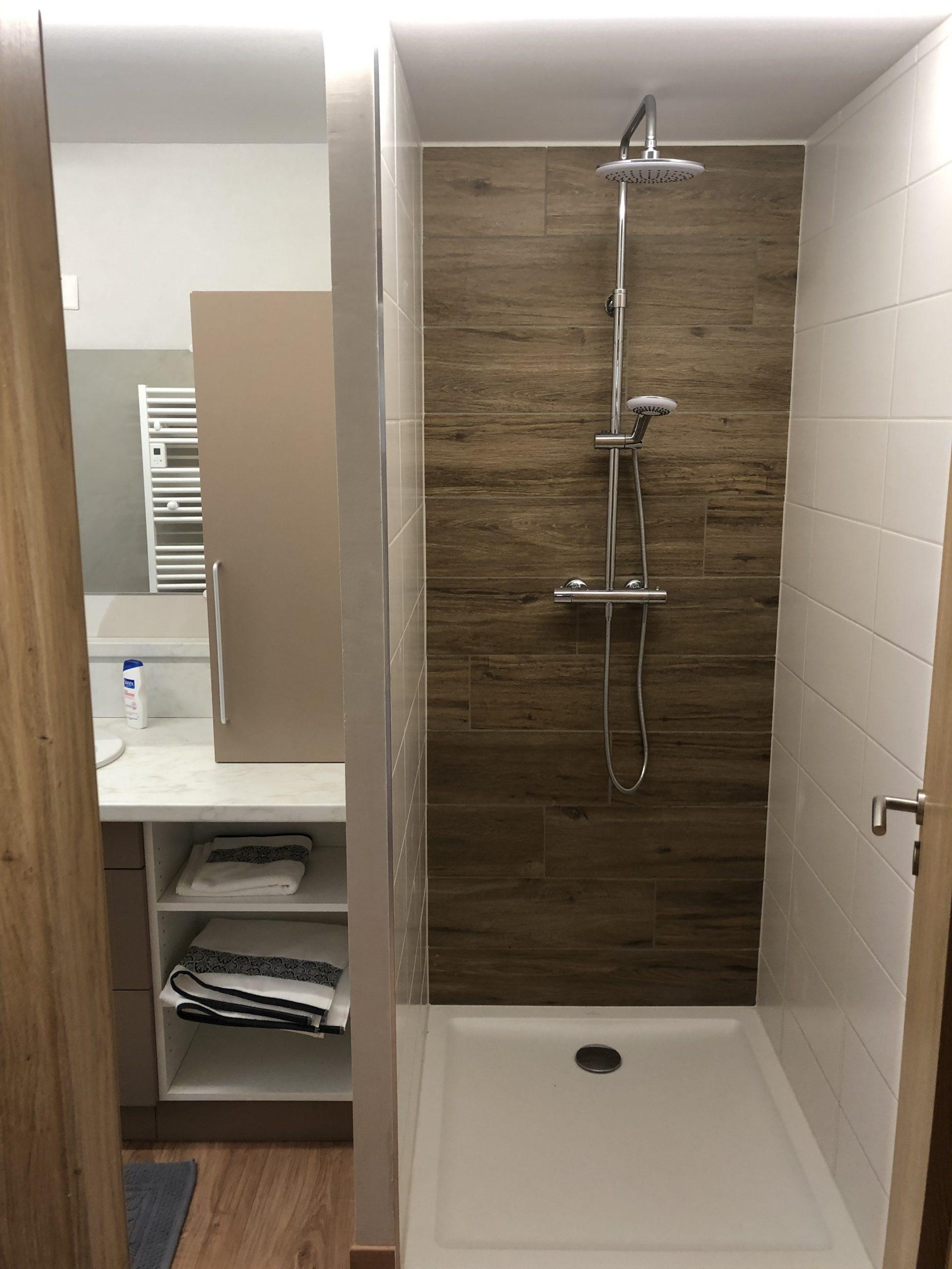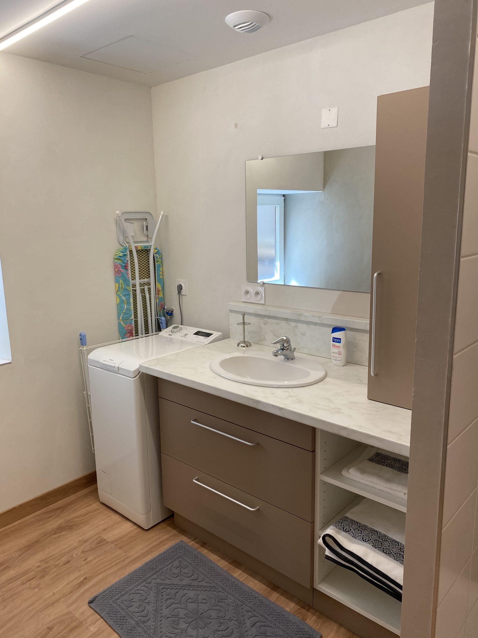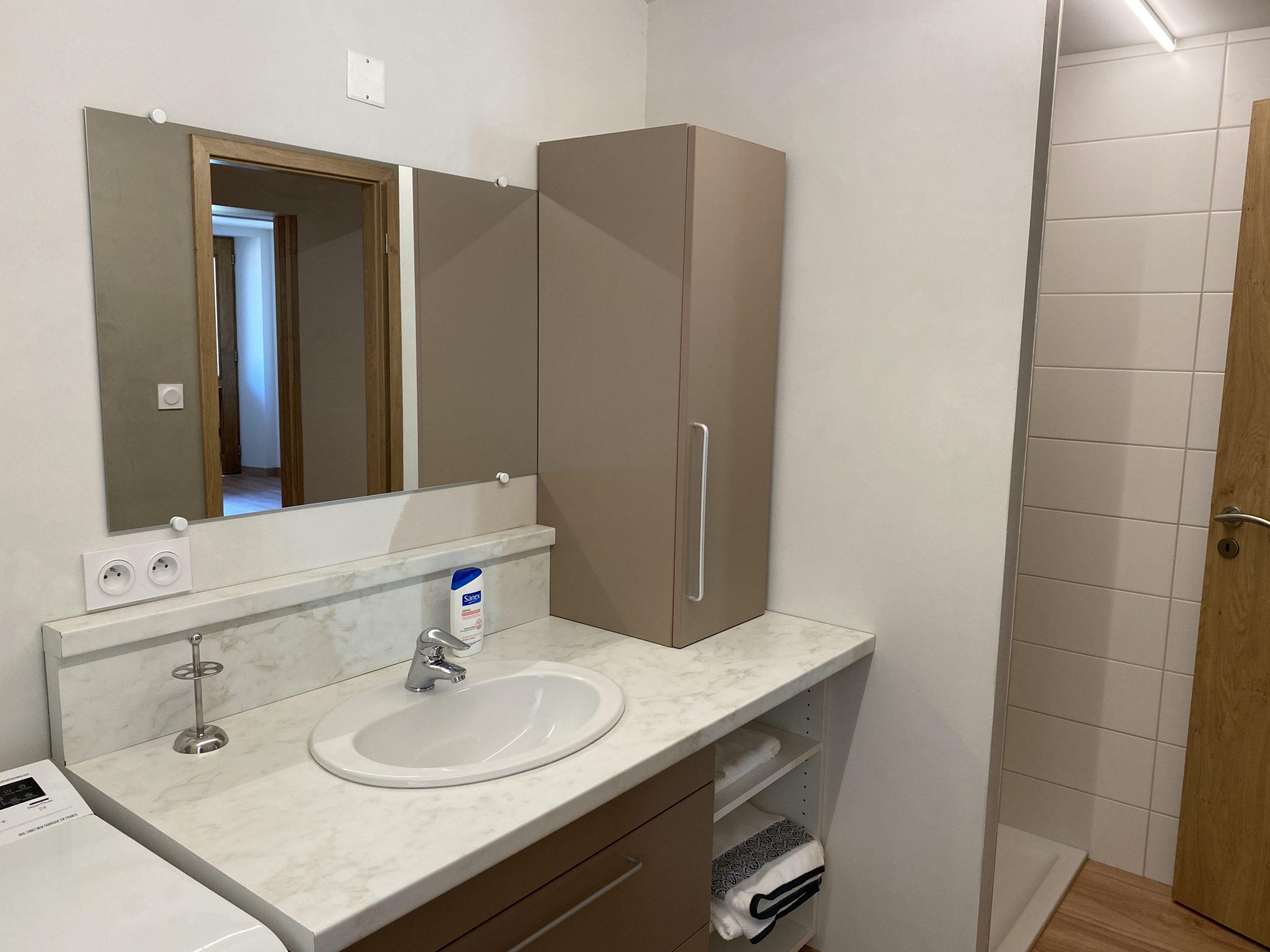 - La salle de bain comprend un meuble avec vasque, un miroir, une douche et un sèche-serviette.